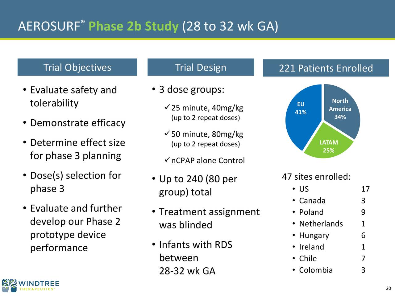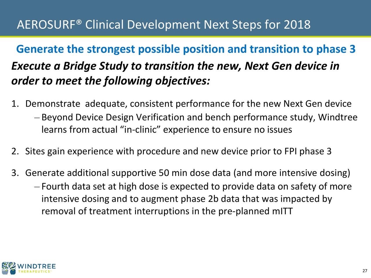 WINDTREE THERAPEUTICS INC /DE/ - EX-99.2 - Windtree Therapeutics EXHIBIT 99.1 - June 29, 2017. Should you invest in windtree therapeutics (nasdaqcm:wint)? Stock analysis for windtree therapeutics inc (wint:nasdaq cm) including stock price, stock chart, company news, key statistics, fundamentals and company profile. See more of windtree therapeutics on facebook. See insights on windtree therapeutics including office locations, competitors, revenue, financials, executives, subsidiaries and more at craft. Windtree therapeutics has 32 employees at their 1 location and $198 k in annual revenue in fy 2019. Windtree's lead product candidate is aerosurf®, a novel, investigational drug/device product that combines the company's proprietary kl4 surfactant and aerosolization technologies. The windtree therapeutics inc equities center is a collection of modules for windtree therapeutics equity research and analysis. Engages in the manufacture and development of products for infants and respiratory diseases. It focuses on producing of surfactant replacement therapies for patients with respiratory disease and neonatology for the improvement of respiratory distress syndrome for infants. Windtree therapeutics, inc., a biotechnology and medical device company, engages in the research and development of products that focus on acute pulmonary and cardiovascular diseases. Contact windtree therapeutics on messenger. It focuses on producing of surfactant replacement therapies for patients with respiratory disease and neonatology for the improvement of respiratory distress syndrome for infants. Engages in the manufacture and development of products for infants and respiratory diseases. Windtree proprietary technology platform includes a synthetic. Windtree therapeutics, inc., a biotechnology and medical device company, engages in the research and development of products that focus on acute pulmonary and cardiovascular diseases.